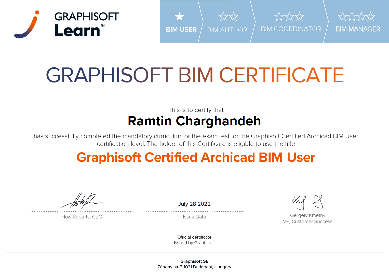 • در صورتی که حداقل نمره قبولی 80% را کسب نموده اید لطفاً برای دریافت گواهینامه اولیه و تک ستاره خود (BIM User + Archicad Basic) به این لینک (یا این شماره در تلگرام: 00989154427780) مراجعه نمایید و درخواست دهید
